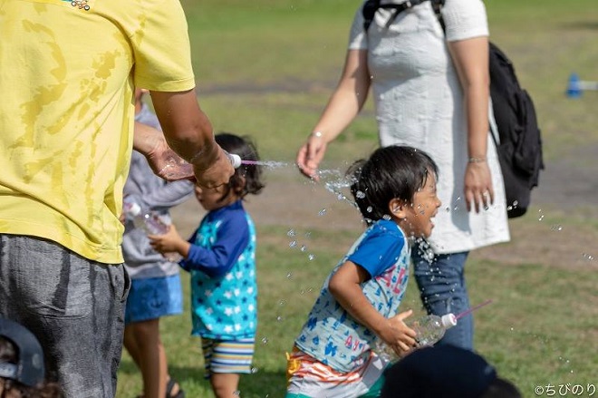 季節の虫を探したり、手づくり水鉄砲、持ってきた遊び道具でグランドと海を駆け巡ります!