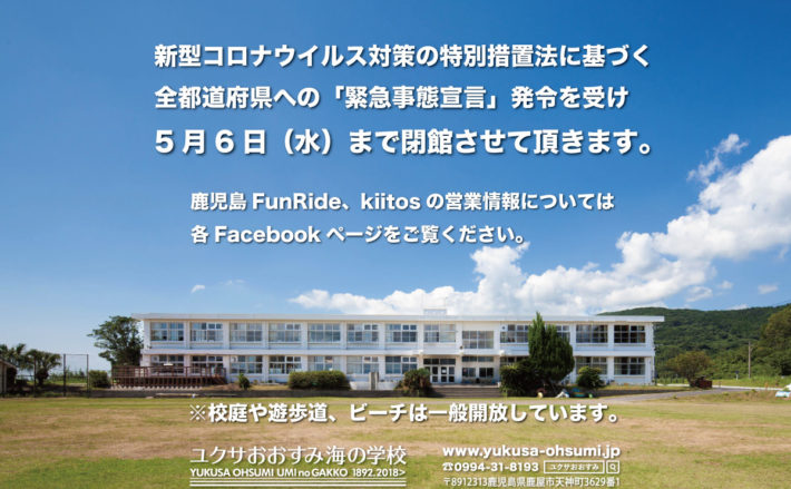新型コロナウイルス対策の特別措置法に基づく全都道府県への「緊急事態宣言」発令を受けユクサおおすみ海の学校は5月6日(水)まで閉館させていただくことになりました。
